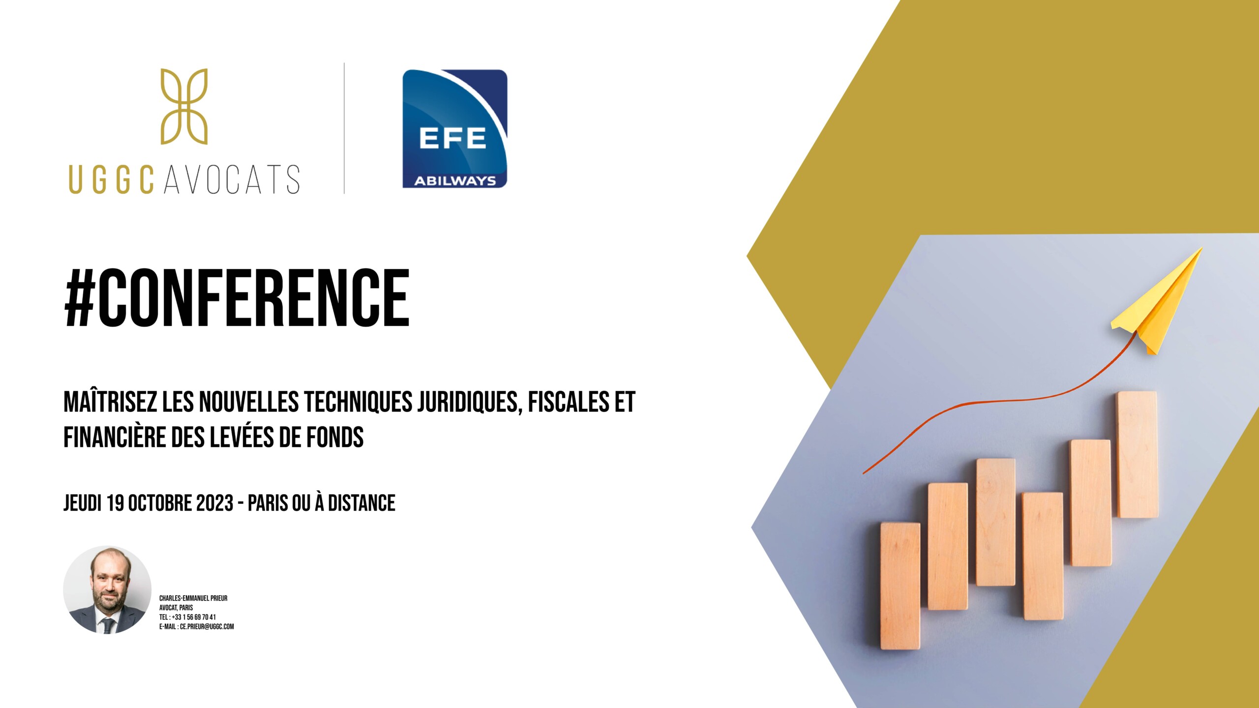 Charles-Emmanuel Prieur, associé UGGC Paris interviendra le jeudi 19 octobre 2023 dans le cadre des conférences d’actualité organisées par l’EFE et animera une session de formation sur le thème « Maîtrisez les nouvelles techniques juridiques, fiscales, et financières des levées de fonds »