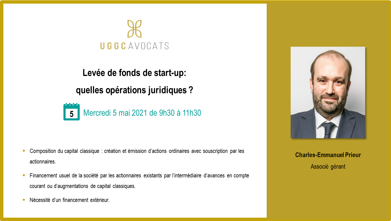 Charles-Emmanuel Prieur, partner of UGGC Avocats in Paris animated a training session on Wednesday, May 5, 2021 on the topic: “Raising funds for start-ups: which legal operations? “