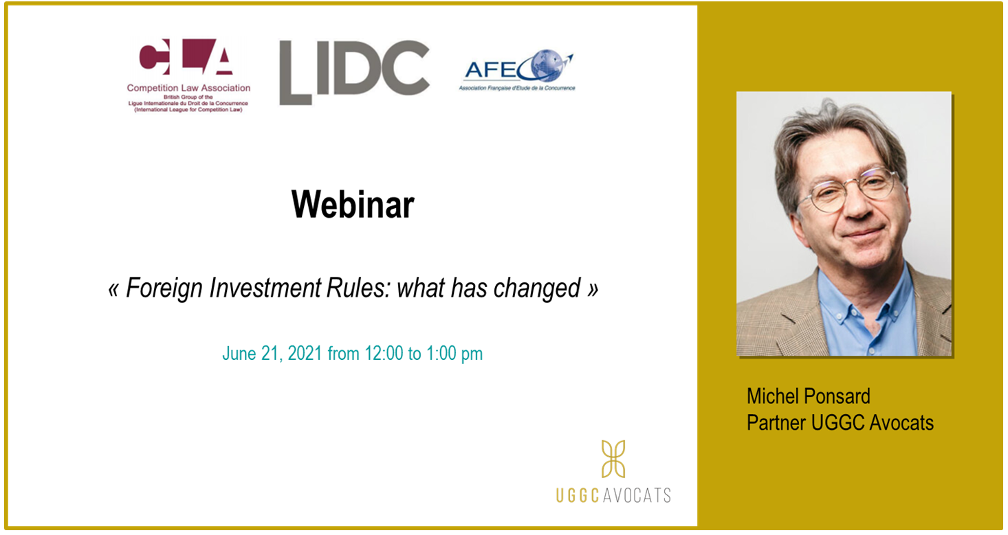 Michel Ponsard, partner at UGGC Avocats specializing in competition and distribution law spoke on June 21, 2021 from 12:00 to 1:00 p.m. in a webinar organized by the International League of Competition Law on the topic: “Foreign Investment Rules: what has changed?”. The panel is composed of French, Swedish, German and English speakers.