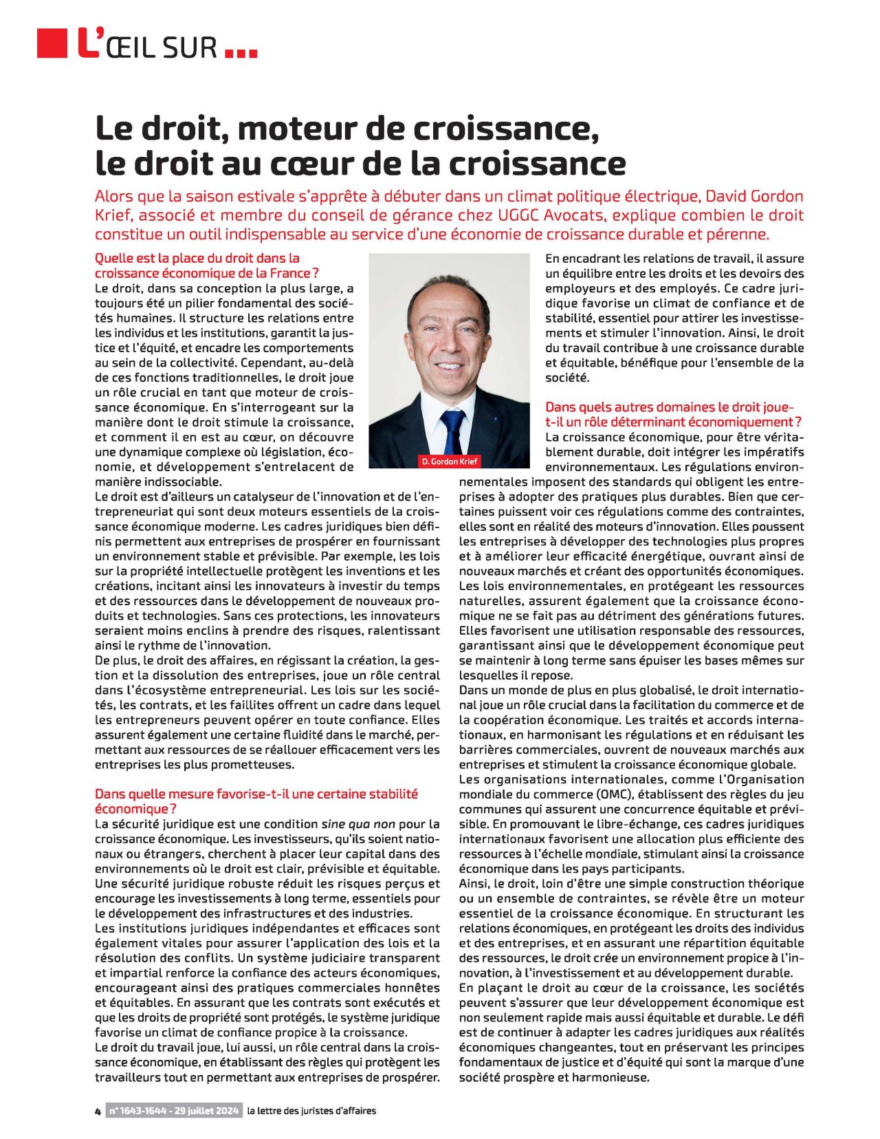 Alors que la saison estivale s’apprête à débuter dans un climat politique électrique, David Gordon Krief, associé et membre du conseil de gérance chez UGGC Avocats, explique combien le droit constitue un outil indispensable au service d’une économie de croissance durable et externe