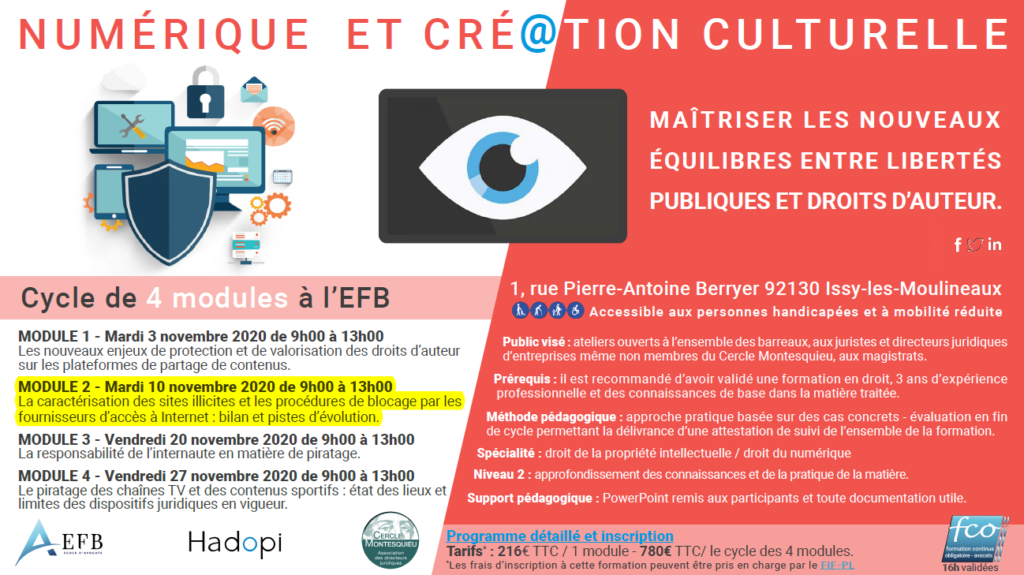 Numérique et cré@tion culturelle – Module à l’EFB sur la maîtrise des nouveaux équilibres entre libertés publiques et droits d’auteur