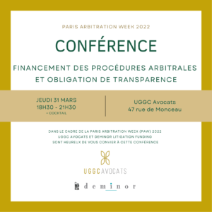 Paris Arbitration Week 2022 : Clémence Lemétais D’Ormesson, associée UGGC Avocats, interviendra aux côtés d’Oliva de Patoul, Mehdi Mellah, Eléonore Toupart et Maximin de Fontmichel, lors de la conférence organisée avec Deminor Recovery sur le thème : « Financement des procédures arbitrales et obligation de transparence »