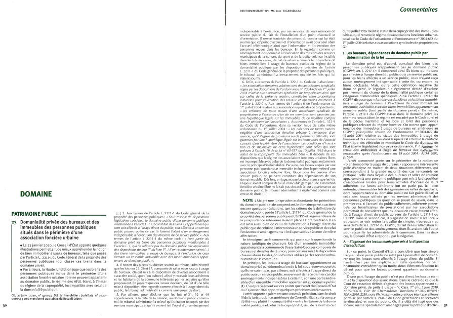 Patrimoine public | Domanialité privée des bureaux et des immeubles des personnes publiques situés dans le périmètre d’une association foncière urbaine | Mai 2020