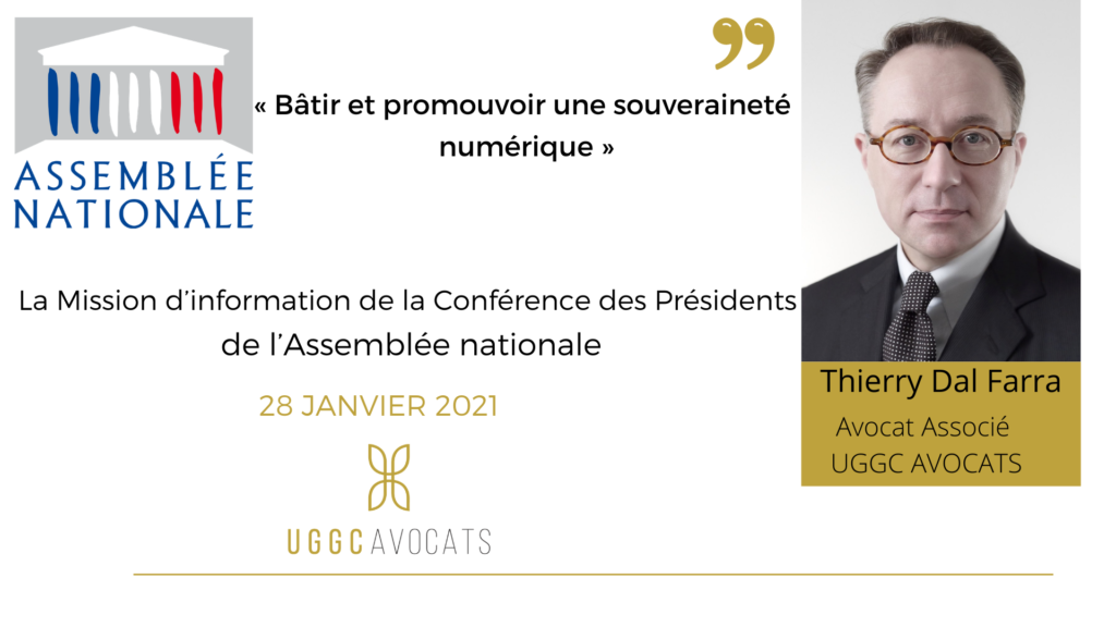 Thierry Dal Farra a été auditionné le 28 janvier 2021 par la Mission d’information de la Conférence des Présidents de l’Assemblée nationale sur le thème « Bâtir et promouvoir une souveraineté numérique » présidée par M. Jean-Luc Warsmann, sur le sujet : « Souveraineté numérique de la France et commande publique ».